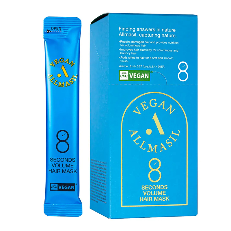 Висококонцентрована маска для волосся Allmasil 8 Seconds Volume Hair Mask під час змішування з водою перетворюється на крем і м'яко огортає волосся, надаючи йому об'єму, відновлює пружність та еластичність. Інноваційна формула косметичного продукту містить тільки веганські інгредієнти: гідролізовані рисові, кукурудзяні, вівсяні, соєві протеїни, екстракти евкаліпта, лаванди, хауттюйнії, гамамелісу, ментол, аргінін, лецитин.