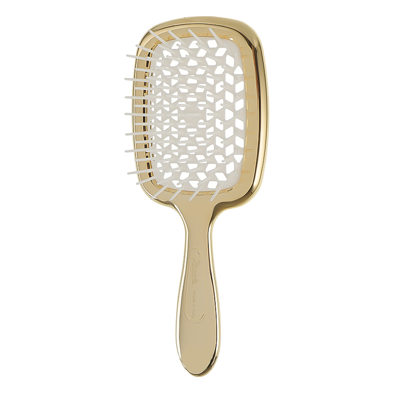 [Janeke] Гребінець SUPER BRUSH білй з золотом. SUPERB SH JANEKE – це якість, перевірена досвідом, адже вже понад 180 років даний італійський бренд випускає гребінці аксесуари для волосся. Superb sh – інноваційна серія гребінців із карбонового волокна. Тільки цей матеріал має властивість ліквідувати статичну електрику. А воно, як відомо, негативно впливає на структуру волосся і сильно її виснажує, витончуючи волосинку. Superb sh термостійка. Завдяки чому відкриває нові обрії для творчих укладок. Важливо, форму з отворами, які нагадують бджолиний вулик і допомагають у швидкому укладання волосся. Переваги унікальної Superb sh: Унікальна пеорація на зубчиках з нейлону не висмикує волосся, а ставиться до нього максимально дбайливо. Волосся висихає за кілька хвилин. Superb sh пройшов гігієнічні тести та довів свою безпеку. Спосіб застосування: Використовуйте гребінець для розчісування волосся. Виробник: GIORGIO JÄNEKE S.r.l., Via Verdi, 920837 Veduggio (MB), Italia.