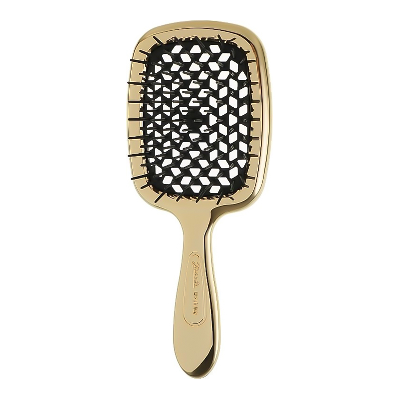 [Janeke] Гребінець SUPER BRUSH золото з чернрим. SUPERB SH JANEKE – це якість, перевірена досвідом, адже вже понад 180 років даний італійський бренд випускає гребінці аксесуари для волосся. Superb sh – інноваційна серія гребінців із карбонового волокна. Тільки цей матеріал має властивість ліквідувати статичну електрику. А воно, як відомо, негативно впливає на структуру волосся і сильно її виснажує, витончуючи волосинку. Superb sh термостійка. Завдяки чому відкриває нові обрії для творчих укладок. Важливо, форму з отворами, які нагадують бджолиний вулик і допомагають у швидкому укладання волосся. Переваги унікальної Superb sh: Унікальна пеорація на зубчиках з нейлону не висмикує волосся, а ставиться до нього максимально дбайливо. Волосся висихає за кілька хвилин. Superb sh пройшов гігієнічні тести та довів свою безпеку. Спосіб застосування: Використовуйте гребінець для розчісування волосся. Виробник: GIORGIO JÄNEKE S.r.l., Via Verdi, 920837 Veduggio (MB), Italia.