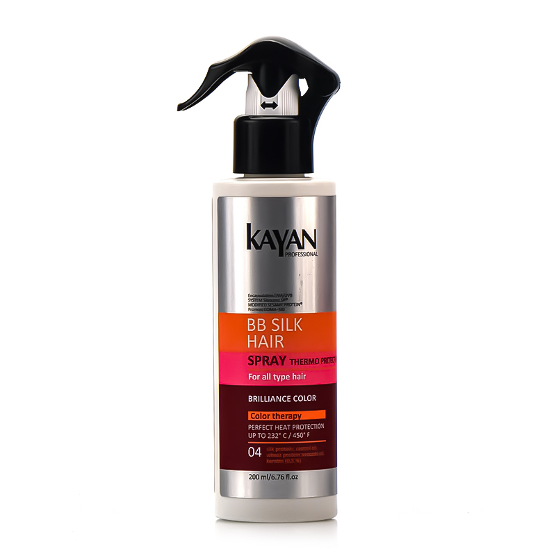 Щоб зберегти насиченість відтінку волосся після фарбування, а також забезпечити надійний термозахист, використовуйте високоефективний спрей Kayan Professional BB Silk. Його унікальна формула з протеїнами шовку та пшениці, кератином, касторовою та олією авокадо інтенсивно дбає про локони, запобігаючи їх знебарвленню, пошкодженню та ламкості.