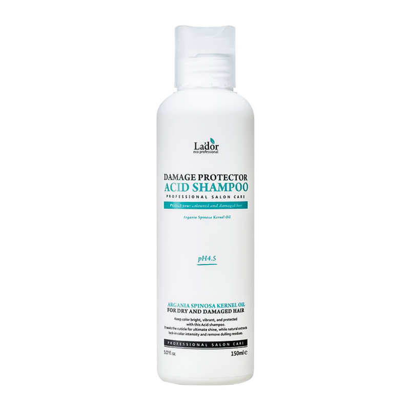 [Lador] ШАМПУНЬ безлужний з pH 4.5 Damage Protector Acid Shampoo, 150мл. Безлужний шампунь з pH 4.5 La'dorDamage Protector Acid Shampoo ефективно відновлює кислотно-лужний баланс і надійно захищає інтенсивність кольору ваших локонів. Засіб запобігає вимиванню пігментів, що фарбують, з кортексу волосся. Воно практично не піниться, проте відмінно очищає від забруднень, себуму, що накопичився, і залишків засобів для укладання.