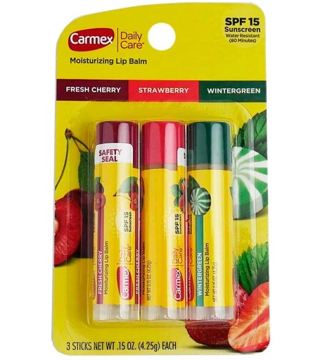[CARMEX] Набор бальзамов для губ в стике CARMEX 3-Pack Cherry, Strawberry, Wintergreen SPF 15 3х4,25 г Набор для губ Carmex состоит из 3-х водостойких увлажняющих солнцезащитных бальзамов с SPF 15. Средства за уходом губ делают губы мягкими, гладкими и ухоженными, ежедневно увлажняют и защищают от солнца, помогают предотвратить появления солнечных ожогов. Также бальзам для губ имеет нежную текстуру и приятный аромат сочной вишни, клубники и мяты. Способ применения: Нанесите небольшое количество бальзама на чистые, сухие губы.