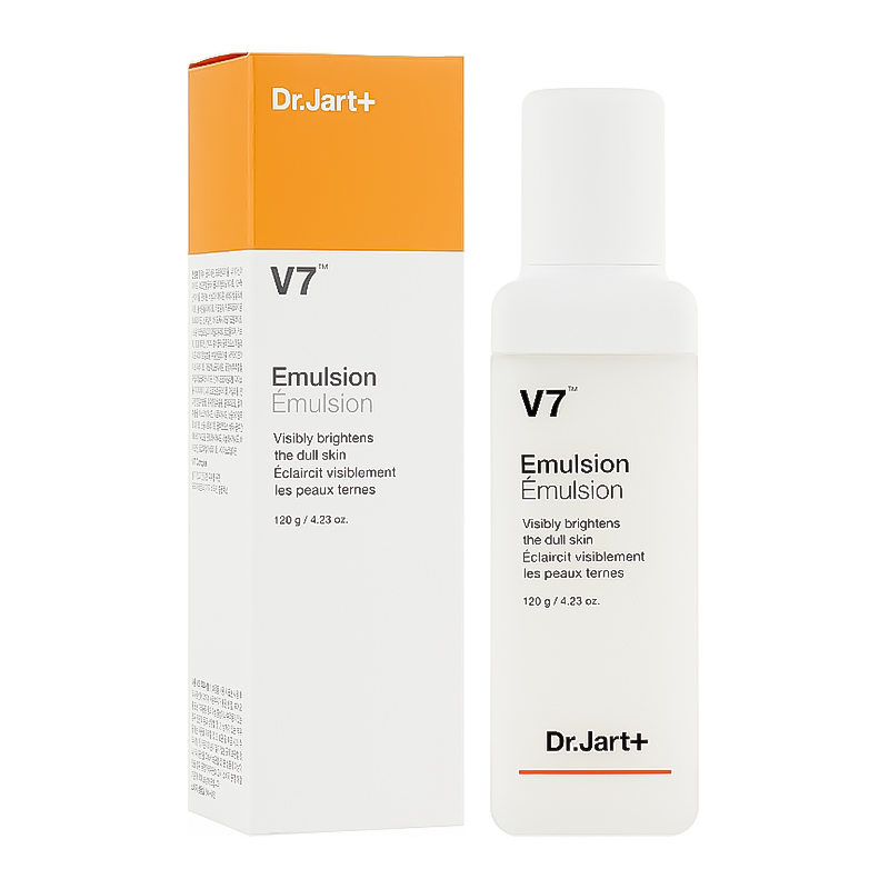 "Осветляющая эмульсия DR.JART+ V7 Emulsion увлажняет сухую и грубую кожу, возвращает ей здоровый цвет и эластичность. Эмульсия обеспечивает максимальный баланс влаги и укрепляет текстуру кожи. Все продукты этой линии на 50% состоят из запатентованного коктейля семи витаминов, в котором каждый витамин играет свою важную роль в возвращении вашей коже молодости и красоты. Витамины А и Е – нейтрализуют действие свободных радикалов и способствуют образованию коллагена, что повышает эластичность и упругость кожи. Витамин С – укрепляет стенки сосудов и повышает иммунитет, Витамин Н активирует клеточный метаболизм. В5 отвечает за обновление клеток. В3 способствует лучшей циркуляции крови. В то время как, Витамин F вообще называют витамином молодости, потому что он отвечает за гидролипидный баланс. Гелевая текстура средства мягко впитывается в кожу, оставляя ощущение свежести и увлажненности.