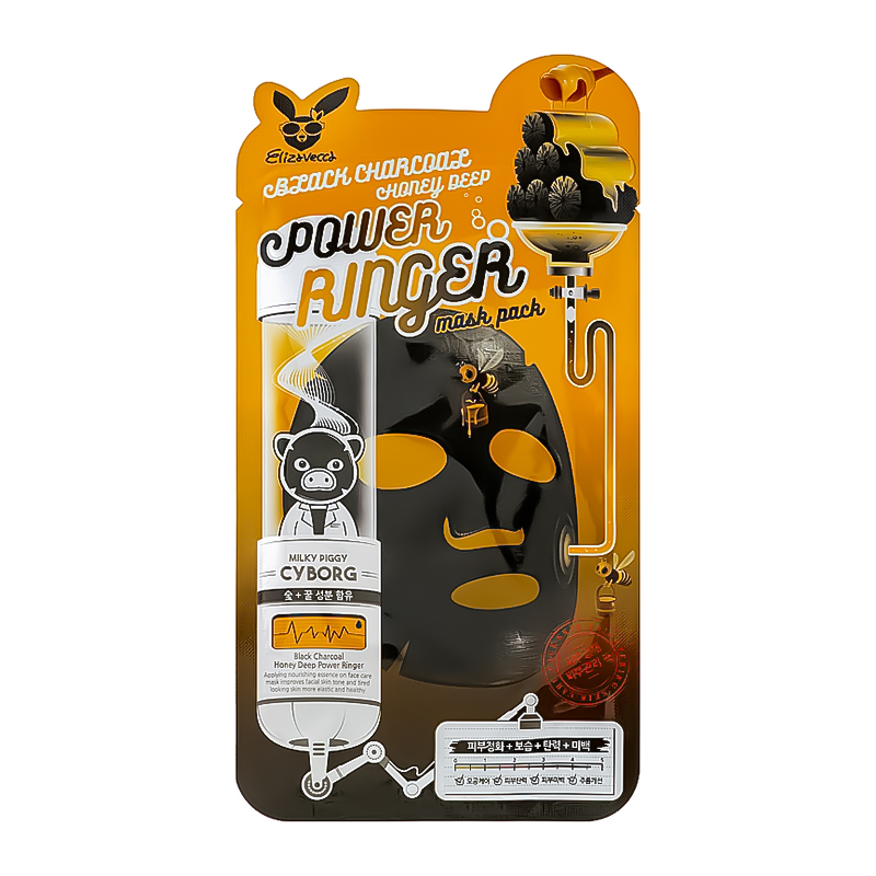 [Elizavecca] НАБОР Тканевая маска для лица ДРЕВЕСНЫЙ УГОЛЬ Black Charcoal Honey Deep Power Ringer Mask Pack, 10 шт