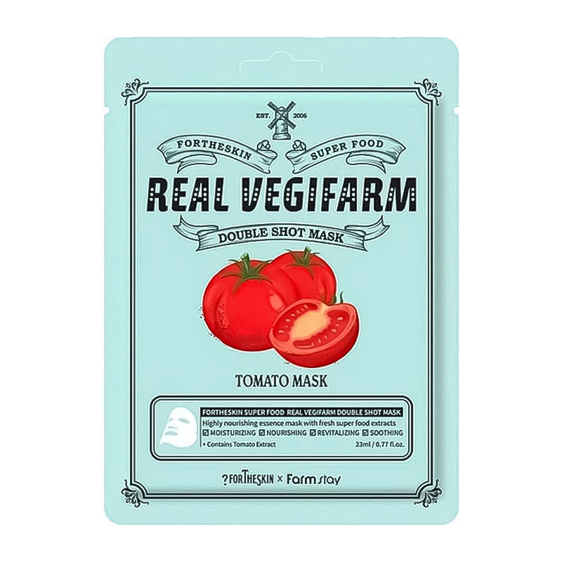 [FORTHESKIN] Тканевая маска для лица ТОМАТ SUPER FOOD REAL VEGIFARM DOUBLE SHOT MASK - Tomato, 23 мл Тканевая маска для лица способствует эффективному питанию и увлажнению. Экстракт томата укрепляет кожу, подтягивает контуры, выравнивает цвет лица и осветляет пигментные пятна. Благодаря активным компонентам, нормализуется работа сальных желез и исчезает неестественный жирный блеск. Кожа приобретает здоровый цвет, поры сужаются и очищаются. Томат является сильным антиоксидантом, замедляющим процесс старения. Он устраняет свободные радикалы, восстанавливает баланс и способствует обновлению клеток. Компоненты маски, благодаря плотному прилеганию, попадают в эпидермис и действуют изнутри. Влага не просто попадает в клетки, а удерживается в них, что благотворно влияет на процесс омоложения.
