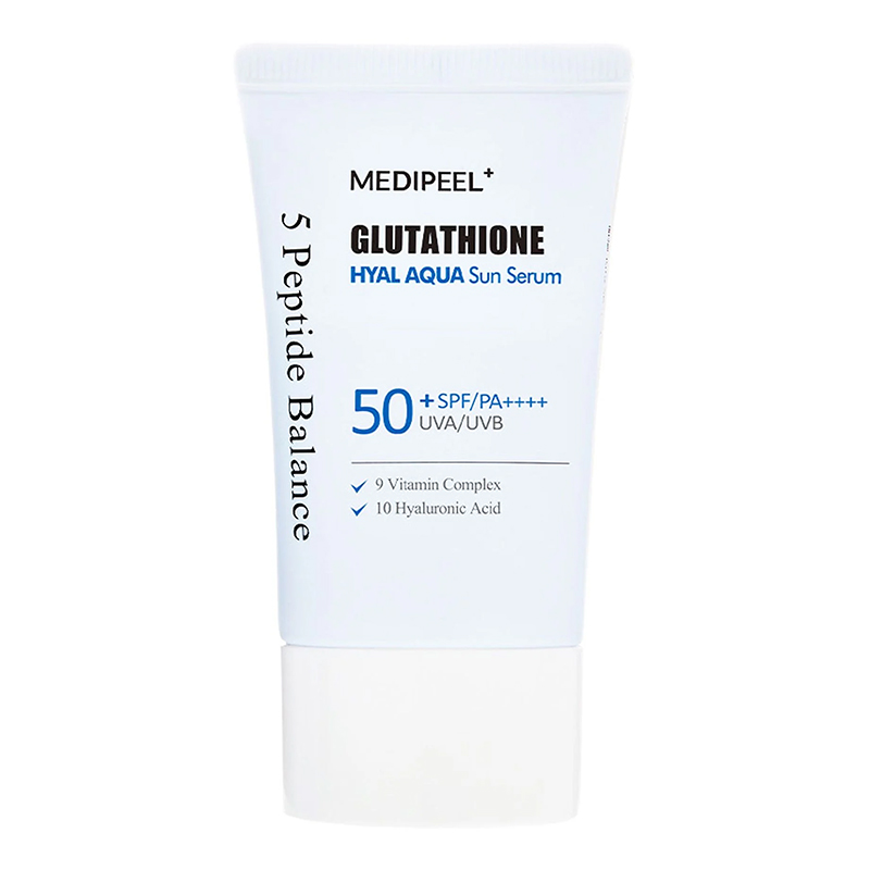 Увлажняющая солнцезащитная сыворотка с осветляющим эффектом Medi-Peel Glutathione Hyal Aqua Sun Serum SPF 50+ PA++++ обладает мощной формулой, содержащей 99% чистого глутатиона и витаминный комплекс, и дающей невероятное увлажнение и сияние коже. Содержит химические солнцезащитные фильтры нового поколения, эффективно защищающие от UVA и UVB-лучей. Обладает лёгкой, увлажняющей текстурой без липкости, не оставляет белых следов. Способ применения: за 15-20 минут до выхода на улицу нанесите крем на лицо и другие открытые участки кожи. Для нанесения на лицо и шею используйте 1,2 мл продукта (1/3 чайной ложки). При нахождении на открытом солнце, например, на пляже, обновляйте защитный слой каждые 2 часа.