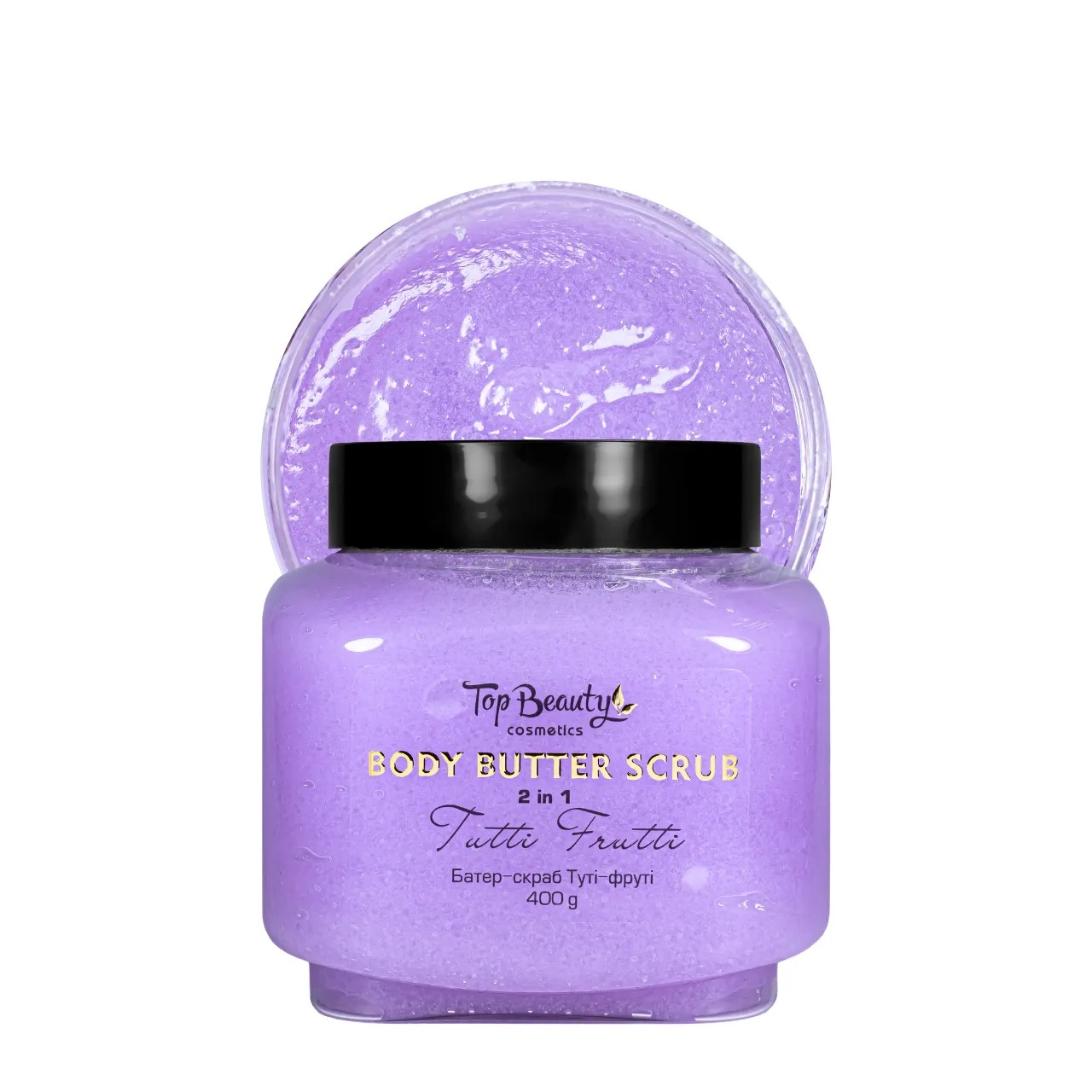 [Top Beauty] Батер-скраб для тела 2 в 1 Тути-фрути, 400 г Скраб для тела от бренда Топ Бьюти на основе масел ши, кокоса прекрасно очищает кожу от ороговевшего верхнего слоя, убирая шелушения и сухость, возвращает ей гладкость, упругость и влажность. В состав скраба вошла молочная кислота, помогающая поддержать здоровый pH кожи. Мелкие кристаллы сахарного скраба для тела нежно, не травмируя, шлифуют эпидермис, мгновенно делают его шелковистым и очень приятным на ощупь, усиливают микроциркуляцию крови.